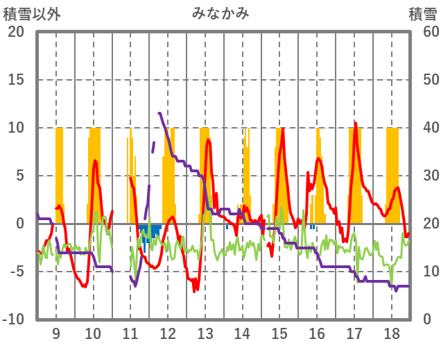 | 日 | 時 | 気温 | 降水 | 風向/風速 | 日照 | 積雪 | 降雪 |
