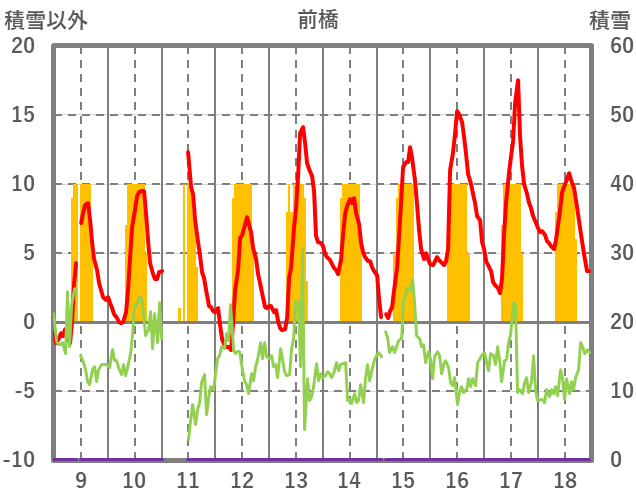 | 日 | 時 | 気温 | 降水 | 風向/風速 | 日照 | 積雪 | 降雪 |