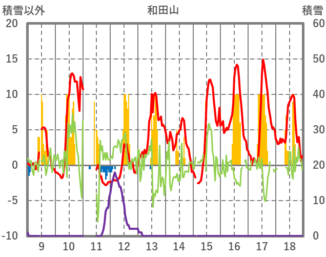 | 日 | 時 | 気温 | 降水 | 風向/風速 | 日照 | 積雪 | 降雪 |
