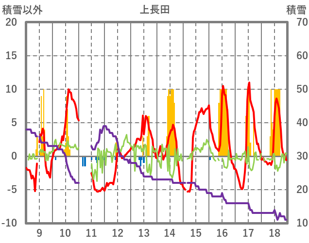| 日 | 時 | 気温 | 降水 | 風向/風速 | 日照 | 積雪 | 降雪 |