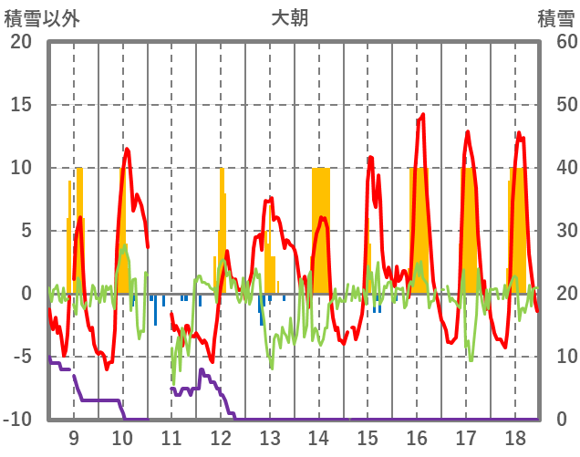 | 日 | 時 | 気温 | 降水 | 風向/風速 | 日照 | 積雪 | 降雪 |