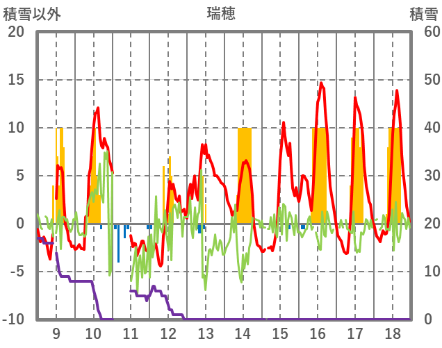 | 日 | 時 | 気温 | 降水 | 風向/風速 | 日照 | 積雪 | 降雪 |