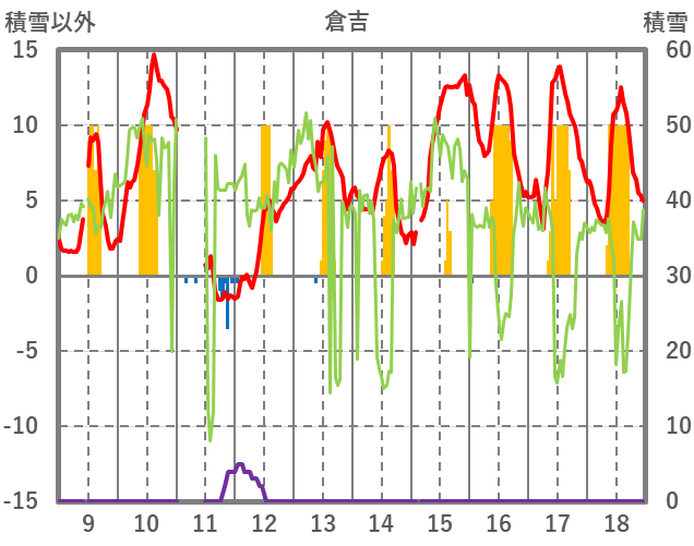 | 日 | 時 | 気温 | 降水 | 風向/風速 | 日照 | 積雪 | 降雪 |