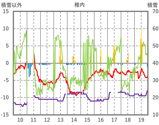 | 日 | 時 | 気温 | 降水 | 風向/風速 | 日照 | 積雪 | 降雪 |