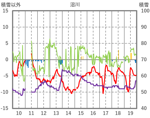 | 日 | 時 | 気温 | 降水 | 風向/風速 | 日照 | 積雪 | 降雪 |