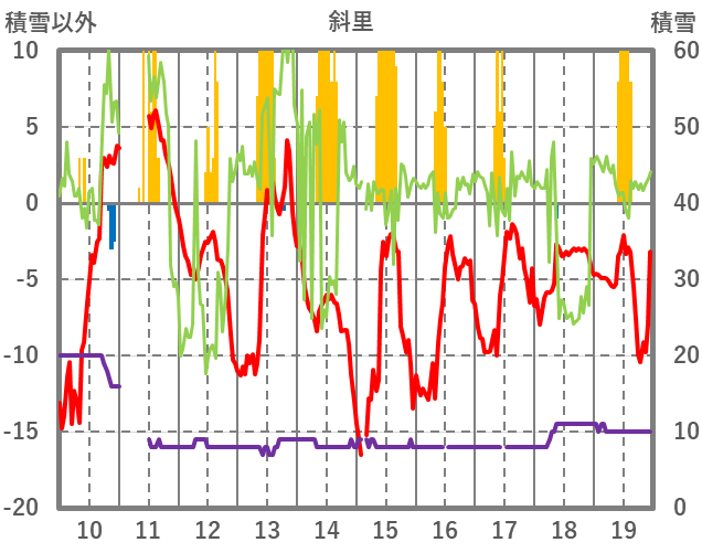 | 日 | 時 | 気温 | 降水 | 風向/風速 | 日照 | 積雪 | 降雪 |