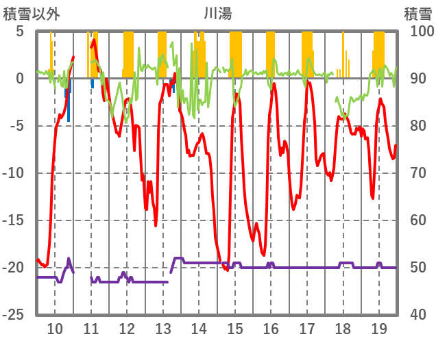 | 日 | 時 | 気温 | 降水 | 風向/風速 | 日照 | 積雪 | 降雪 |