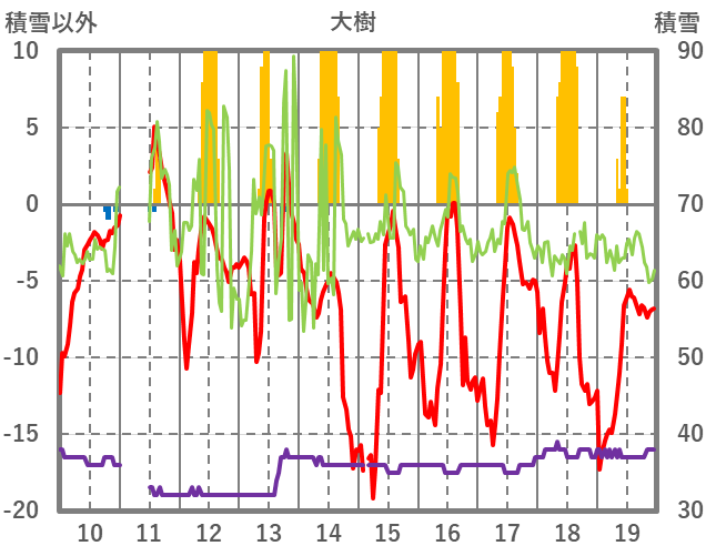 | 日 | 時 | 気温 | 降水 | 風向/風速 | 日照 | 積雪 | 降雪 |