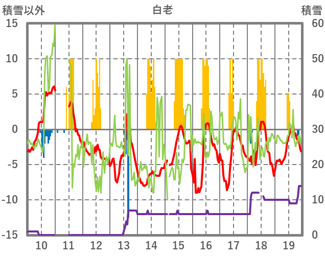 | 日 | 時 | 気温 | 降水 | 風向/風速 | 日照 | 積雪 | 降雪 |
