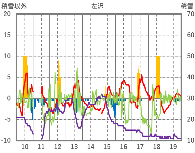 | 日 | 時 | 気温 | 降水 | 風向/風速 | 日照 | 積雪 | 降雪 |