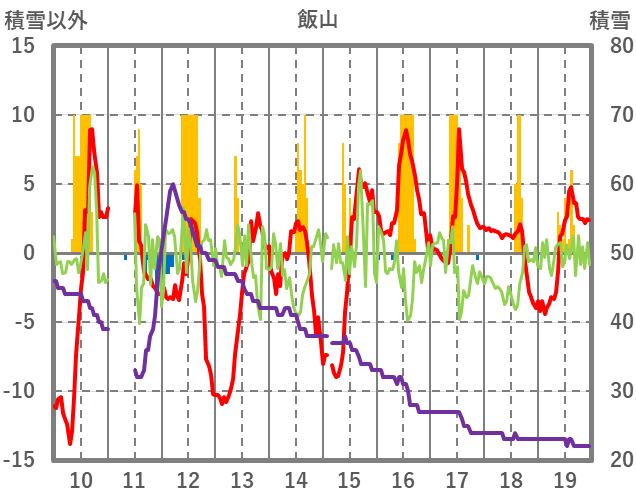 | 日 | 時 | 気温 | 降水 | 風向/風速 | 日照 | 積雪 | 降雪 |