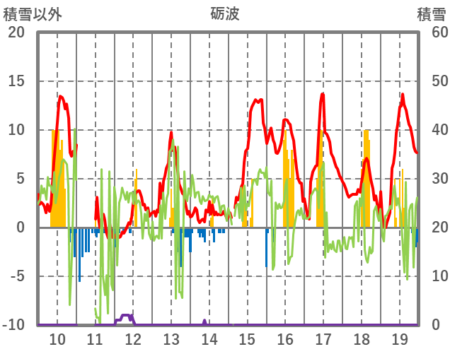 | 日 | 時 | 気温 | 降水 | 風向/風速 | 日照 | 積雪 | 降雪 |