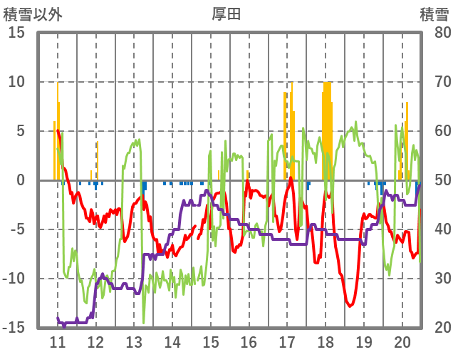 | 日 | 時 | 気温 | 降水 | 風向/風速 | 日照 | 積雪 | 降雪 |