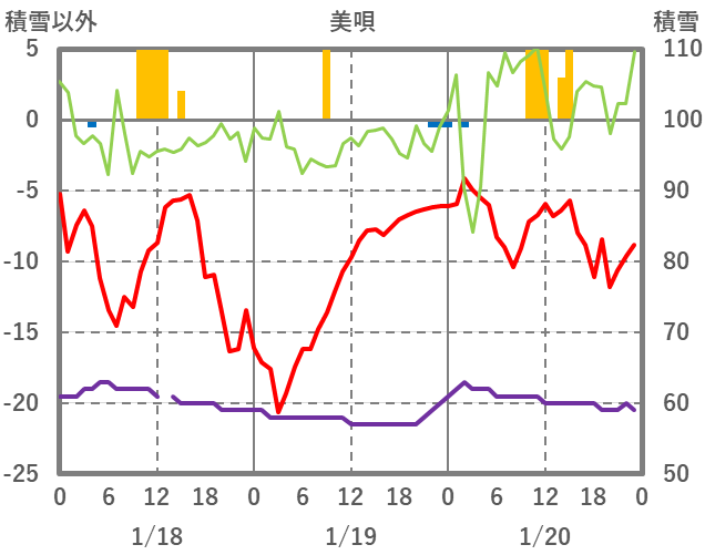 | 日 | 時 | 気温 | 降水 | 風向/風速 | 日照 | 積雪 | 降雪 |