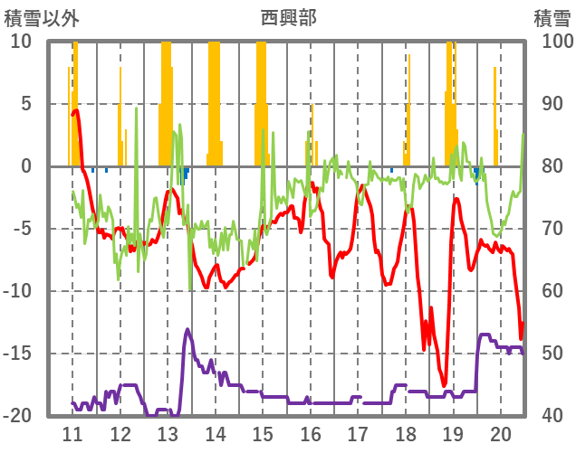 | 日 | 時 | 気温 | 降水 | 風向/風速 | 日照 | 積雪 | 降雪 |