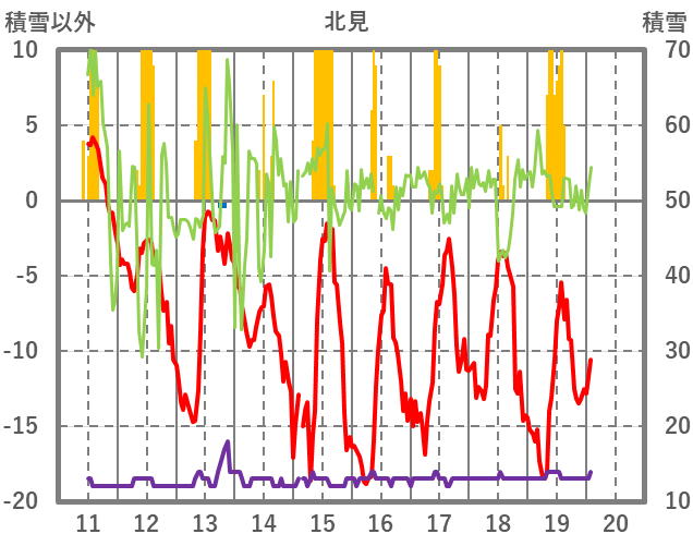 | 日 | 時 | 気温 | 降水 | 風向/風速 | 日照 | 積雪 | 降雪 |