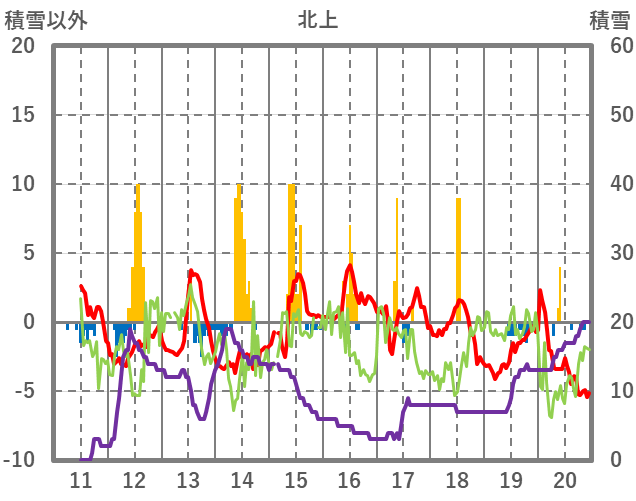 | 日 | 時 | 気温 | 降水 | 風向/風速 | 日照 | 積雪 | 降雪 |