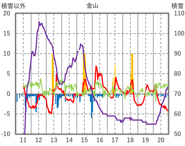 | 日 | 時 | 気温 | 降水 | 風向/風速 | 日照 | 積雪 | 降雪 |