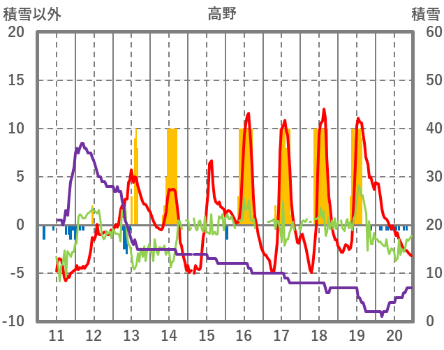 | 日 | 時 | 気温 | 降水 | 風向/風速 | 日照 | 積雪 | 降雪 |