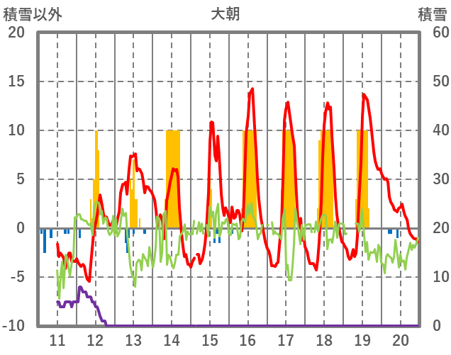 | 日 | 時 | 気温 | 降水 | 風向/風速 | 日照 | 積雪 | 降雪 |