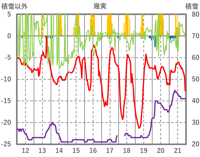 | 日 | 時 | 気温 | 降水 | 風向/風速 | 日照 | 積雪 | 降雪 |