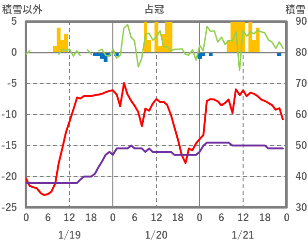 | 日 | 時 | 気温 | 降水 | 風向/風速 | 日照 | 積雪 | 降雪 |