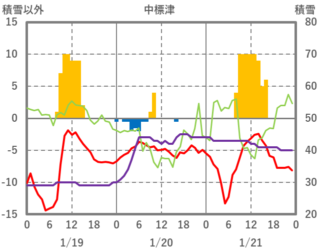 | 日 | 時 | 気温 | 降水 | 風向/風速 | 日照 | 積雪 | 降雪 |