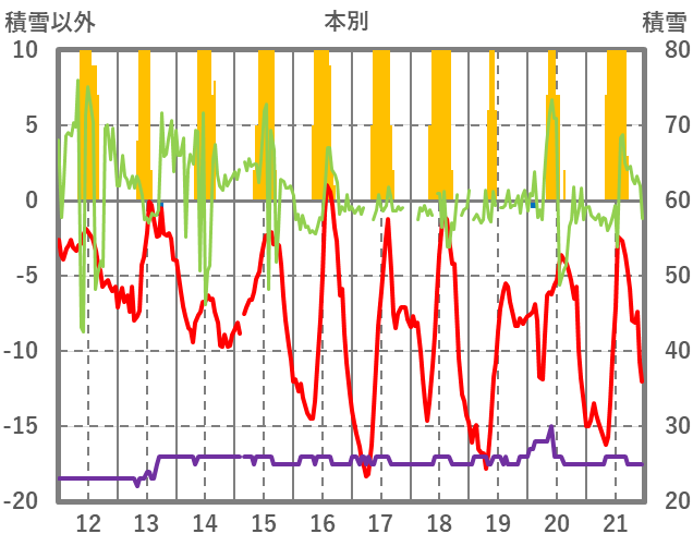 | 日 | 時 | 気温 | 降水 | 風向/風速 | 日照 | 積雪 | 降雪 |