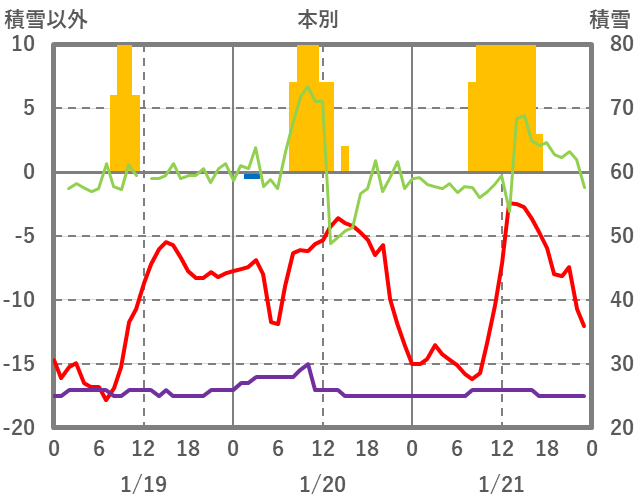 | 日 | 時 | 気温 | 降水 | 風向/風速 | 日照 | 積雪 | 降雪 |