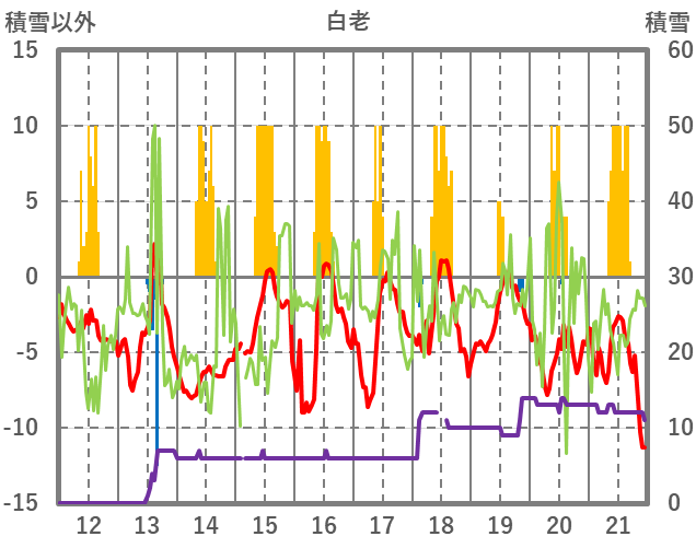 | 日 | 時 | 気温 | 降水 | 風向/風速 | 日照 | 積雪 | 降雪 |