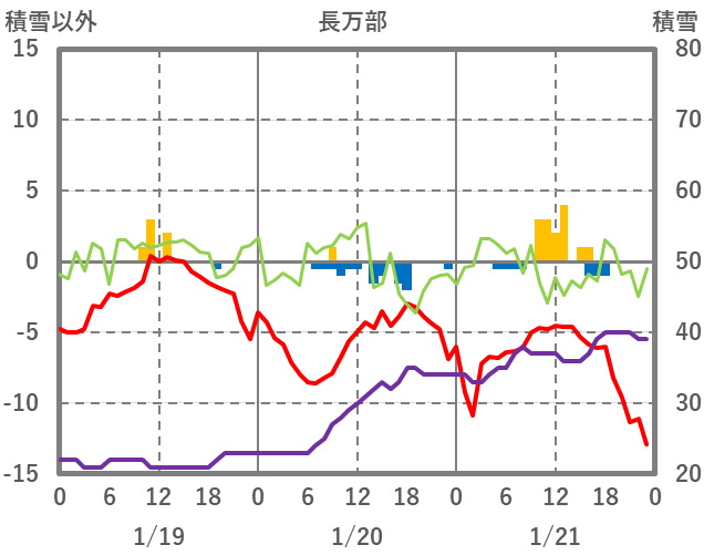 | 日 | 時 | 気温 | 降水 | 風向/風速 | 日照 | 積雪 | 降雪 |
