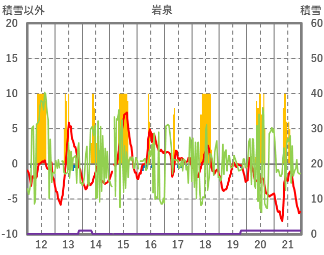 | 日 | 時 | 気温 | 降水 | 風向/風速 | 日照 | 積雪 | 降雪 |
