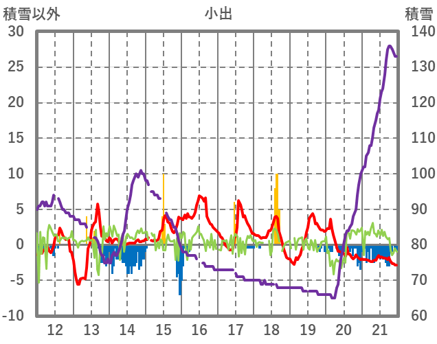 | 日 | 時 | 気温 | 降水 | 風向/風速 | 日照 | 積雪 | 降雪 |