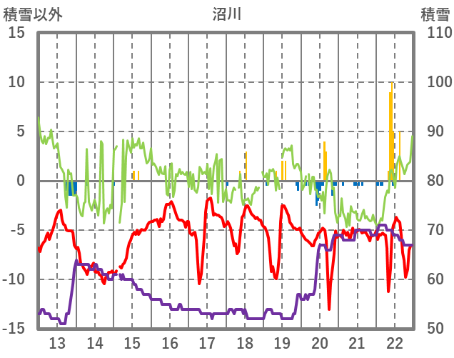 | 日 | 時 | 気温 | 降水 | 風向/風速 | 日照 | 積雪 | 降雪 |