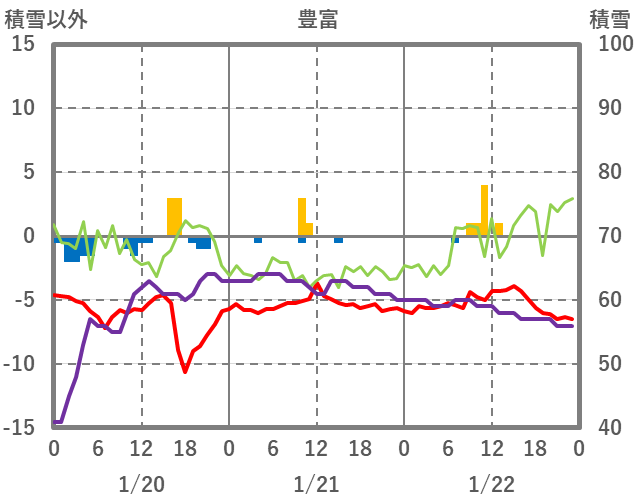| 日 | 時 | 気温 | 降水 | 風向/風速 | 日照 | 積雪 | 降雪 |