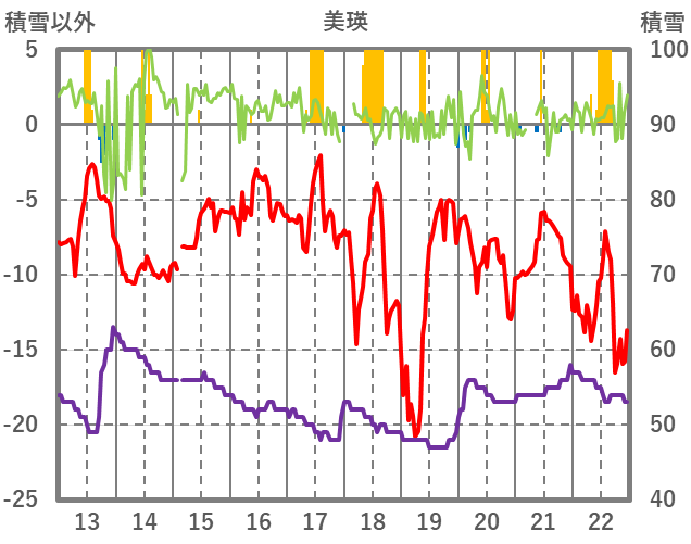 | 日 | 時 | 気温 | 降水 | 風向/風速 | 日照 | 積雪 | 降雪 |