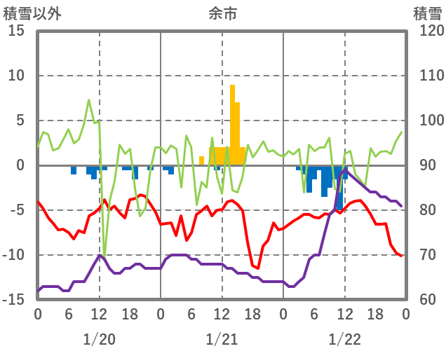 | 日 | 時 | 気温 | 降水 | 風向/風速 | 日照 | 積雪 | 降雪 |