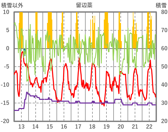 | 日 | 時 | 気温 | 降水 | 風向/風速 | 日照 | 積雪 | 降雪 |