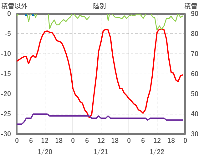| 日 | 時 | 気温 | 降水 | 風向/風速 | 日照 | 積雪 | 降雪 |