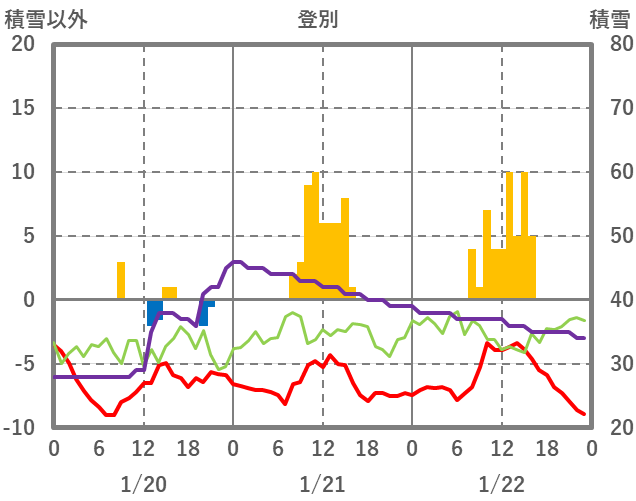 | 日 | 時 | 気温 | 降水 | 風向/風速 | 日照 | 積雪 | 降雪 |