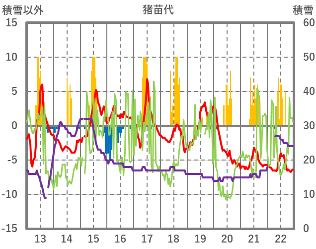 | 日 | 時 | 気温 | 降水 | 風向/風速 | 日照 | 積雪 | 降雪 |