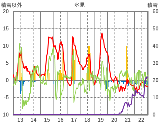| 日 | 時 | 気温 | 降水 | 風向/風速 | 日照 | 積雪 | 降雪 |