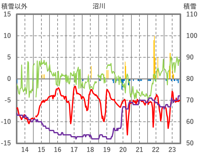 | 日 | 時 | 気温 | 降水 | 風向/風速 | 日照 | 積雪 | 降雪 |