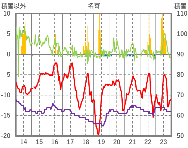 | 日 | 時 | 気温 | 降水 | 風向/風速 | 日照 | 積雪 | 降雪 |