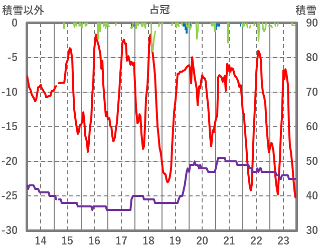 | 日 | 時 | 気温 | 降水 | 風向/風速 | 日照 | 積雪 | 降雪 |