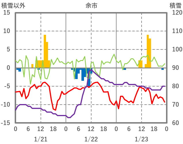 | 日 | 時 | 気温 | 降水 | 風向/風速 | 日照 | 積雪 | 降雪 |