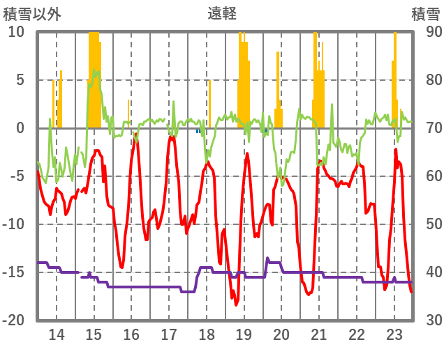 | 日 | 時 | 気温 | 降水 | 風向/風速 | 日照 | 積雪 | 降雪 |