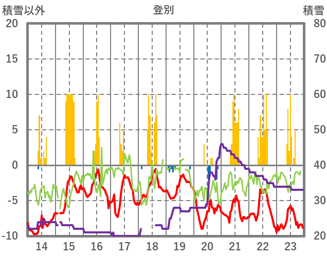 | 日 | 時 | 気温 | 降水 | 風向/風速 | 日照 | 積雪 | 降雪 |
