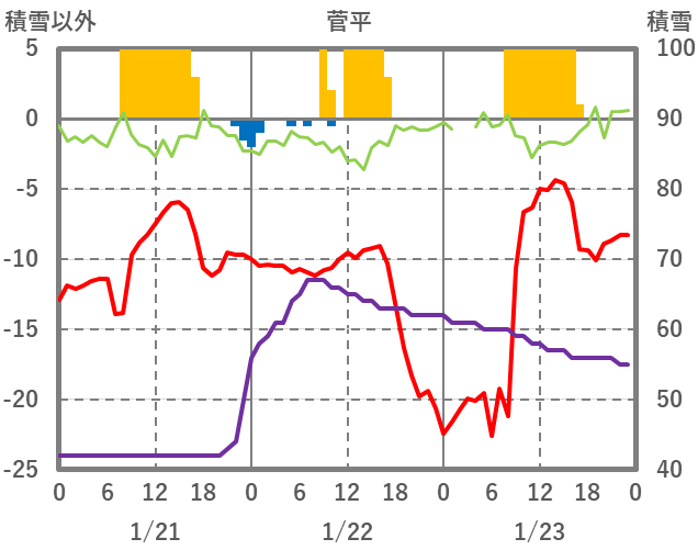 | 日 | 時 | 気温 | 降水 | 風向/風速 | 日照 | 積雪 | 降雪 |