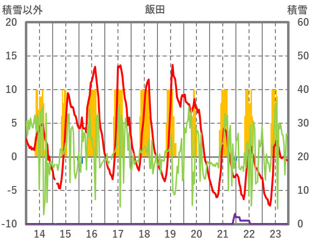 | 日 | 時 | 気温 | 降水 | 風向/風速 | 日照 | 積雪 | 降雪 |